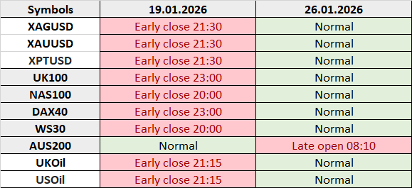 وبناءً على ذلك، سيتم تغيير جدول التداول لبعض الأدوات المالية. يرجى الاطلاع على هذه التغييرات مسبقًا وأخذها في الاعتبار عند التداول.