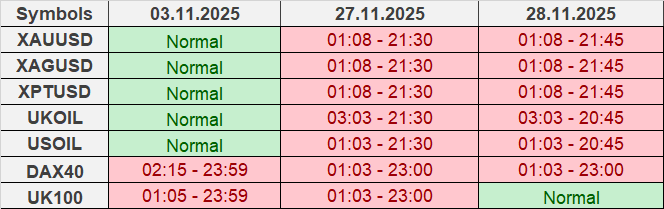 कृपया ध्यान दें कि 3 नवंबर को DAX40 और UK100 के शेड्यूल में बदलाव होंगे, और 27 और 28 नवंबर को संयुक्त राज्य अमेरिका थैंक्सगिविंग डे मनाएगा।